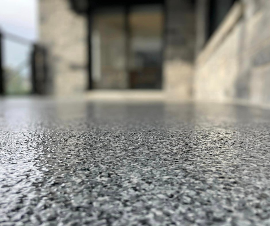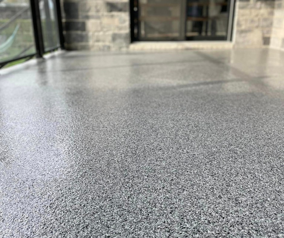 Texture minérale et finition antidérapante, idéale pour les sols intérieurs et garages. Disponible en plusieurs teintes et tailles de flocons. -